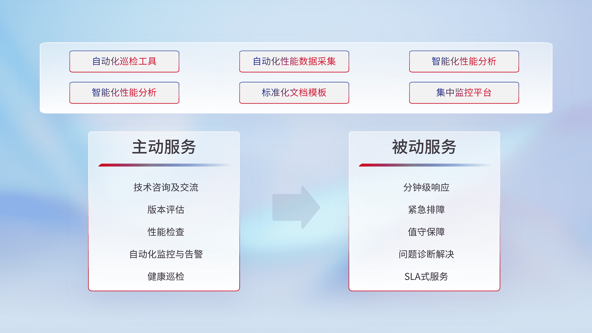 智能化工具和标准化文档,,,保障服务质量,,,提供主动服务(包含技术咨询、、版本评估、、、性能检查、、自动化监控与告警、、、、健康巡检)和被动服务包含(分钟级响应、、紧急排障、、、、值守保障、、、问题诊断解决、、、、SLA服务)。。。